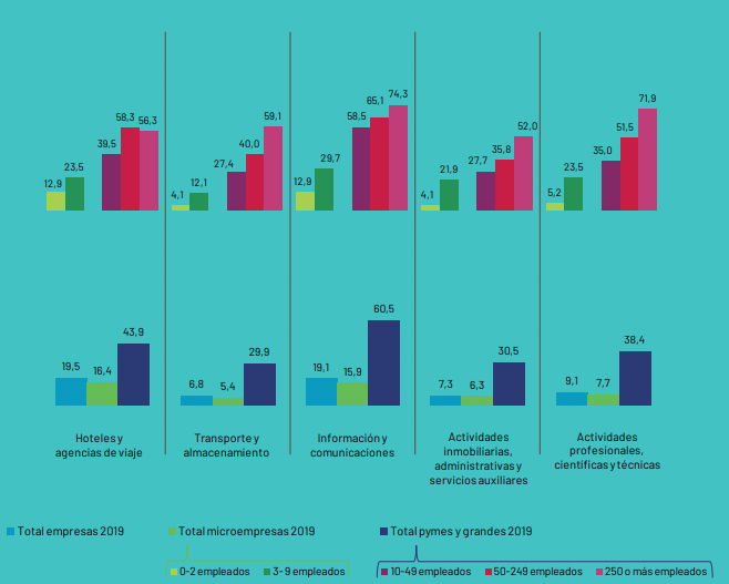 Por último, si hablamos de las microempresas el sector que domina en su uso es el sector de hoteles y agencias de viaje, además del comercio al por mayor pero, debemos decir que su uso está más extendido que en los otros tipos de empresas según su tamaño.
