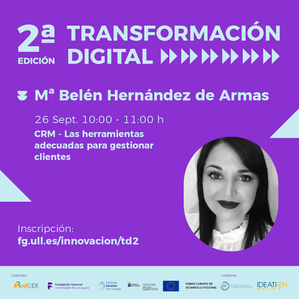 La 2ª edición de «Transformación Digital: Inspiración, Acción e Impacto» está organizada por el centro CIDE de la Fundación General Universidad de La Laguna co-diseñado junto con el equipo de proyecto IDEATION. Una iniciativa de la Consejería de Economía, Conocimiento y Empleo del Gobierno de Canarias, impulsada a través de la Agencia Canaria de Investigación, Innovación y Sociedad de la Información (ACIISI), y cofinanciada por el Fondo Europeo de Desarrollo Regional, con una tasa de cofinanciación del 85% en el marco del Programa Operativo FEDER Canarias 2014-2020. Los webinars no habrían sido posibles sin la colaboración del European Insitute of Innovation and Technology (EIT) a través del programa EIT HEI Iniciative y su proyecto IDEATION: Innovation and entrepreneurship actions and trainings for higher education.