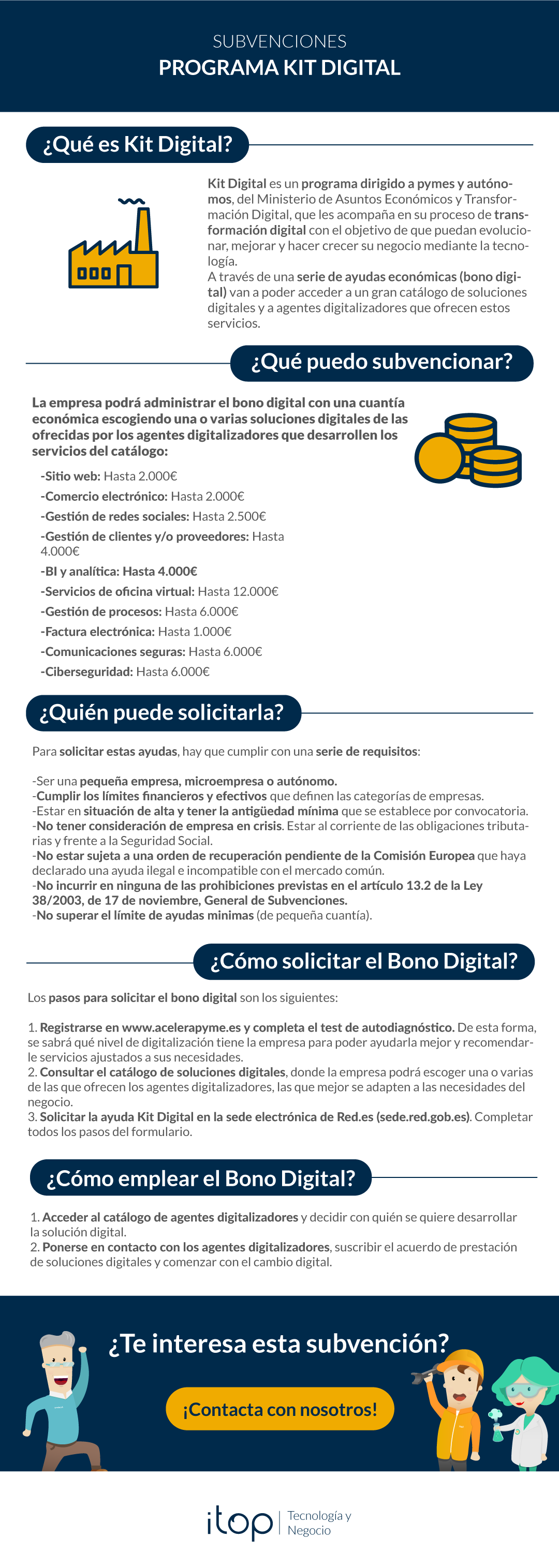 Kit Digital es un programa público de ayudas económicas financiado por los fondos Next Generation EU, dentro del Plan de Recuperación, Transformación y Resiliencia, dirigido a pymes y autónomos, del Ministerio de Asuntos Económicos y Transformación Digital, que les acompaña en su proceso de transformación digital con el objetivo de que puedan evolucionar, mejorar y hacer crecer su negocio mediante la tecnología.