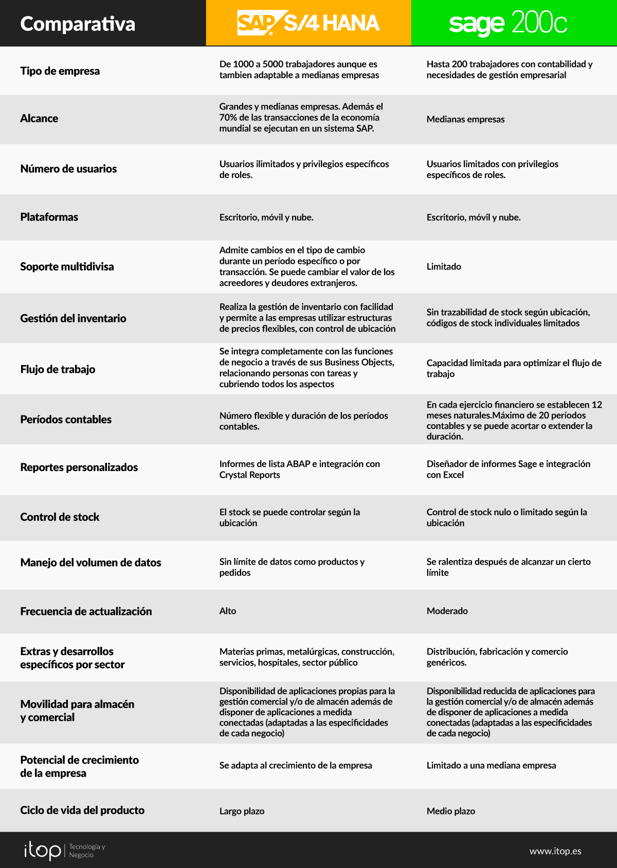 A continuación haremos una comparativa entre 4 soluciones ERP bastante conocidas como son SAP Business One, SAP S/4 HANA, SAGE 50 y SAGE 200C, dónde analizaremos sus características principales para poder tener claro cuál nos puede ayudar de mejor manera.