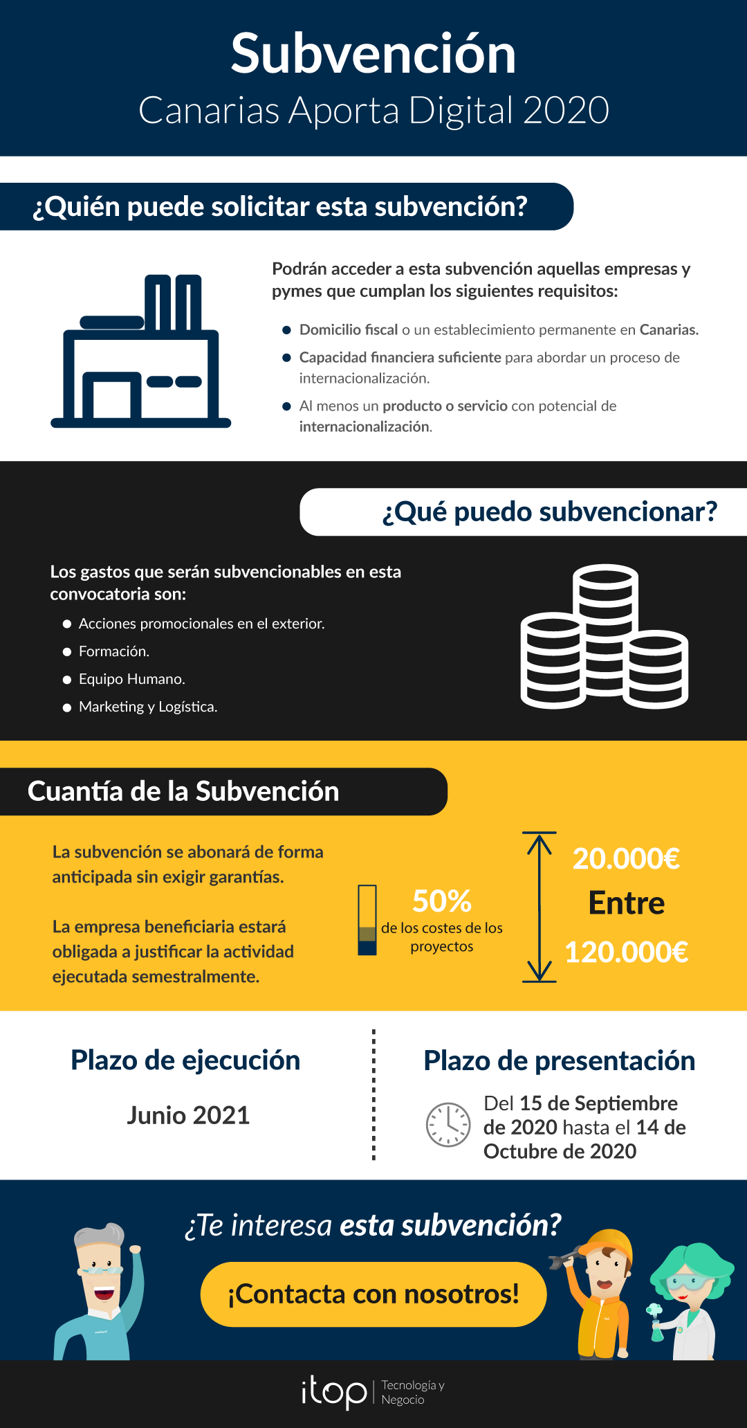 Desde Itop te acompañamos durante todo el proceso de implantación que vayas a realizar y te facilitamos en tiempo y forma toda la documentación que necesitas presentar para la justificación del proyecto tecnológico que hemos acometido para la mejora de los procesos en tu empresa.
