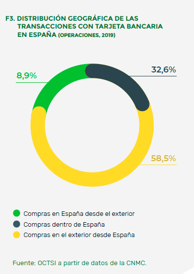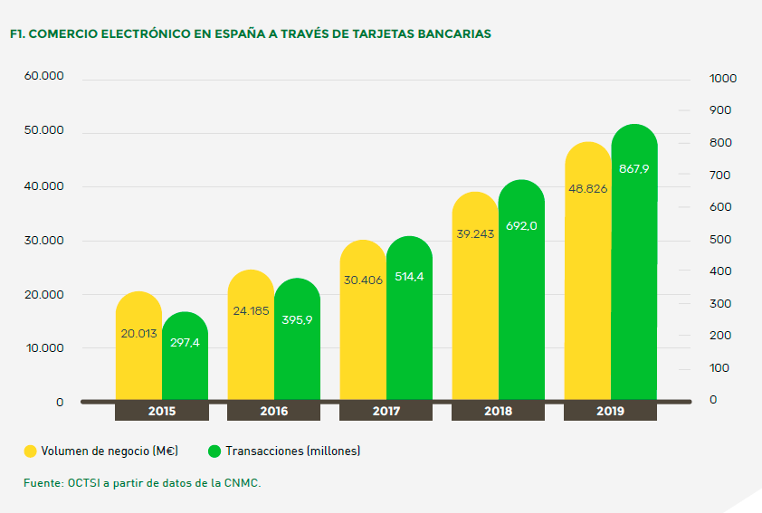 Según la Comisión Nacional de los Mercados y la Competencia (CNMC), el comercio electrónico a través de tarjetas de crédito facturó en España 48.826 millones de euros en 2019 (un 24% más que el año anterior) con 868 millones de transacciones (con un crecimiento interanual del 25%).
