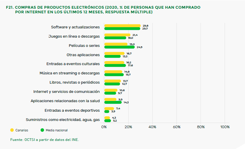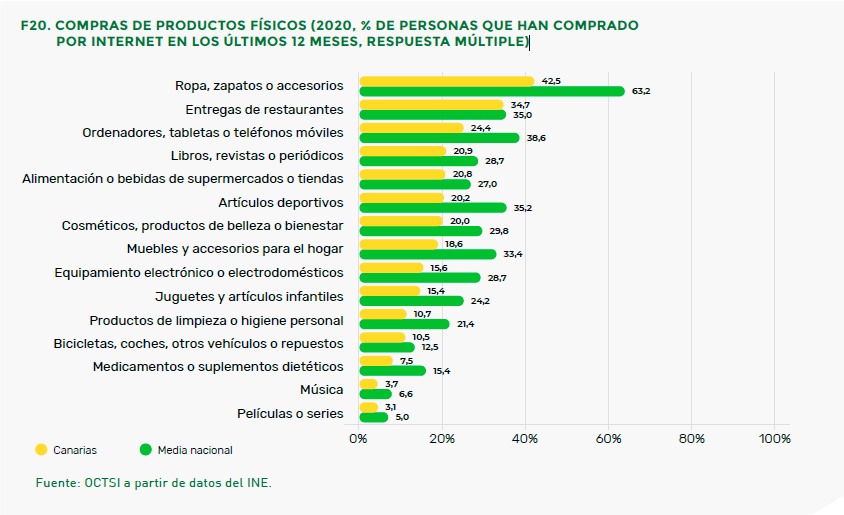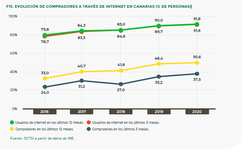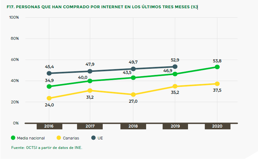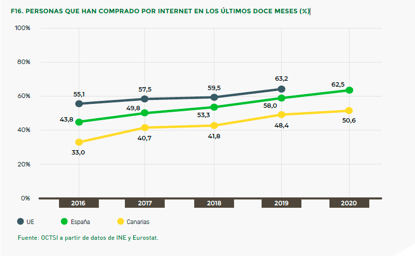 En el año 2019 un 50,6% de la población de Canarias entre 16 y 74 años realizó compras por comercio electrónico, lo que supone cerca de 900.000 personas. A pesar del crecimiento experimentado en el último año, la cifra del Archipiélago se distancia de la media nacional, que supera el 62%. La tasa de crecimiento anual compuesto en los últimos cinco años es del 9,3% en España y del 11,3% en Canarias.