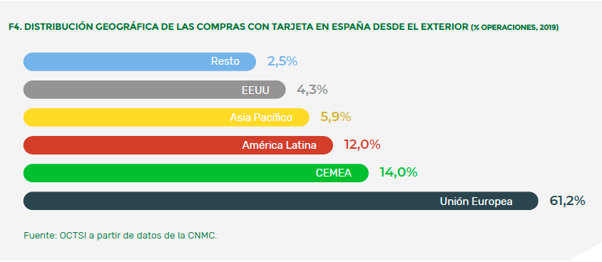 Por número de transacciones, las compras en el exterior desde España alcanzan el 59%, mientras que las compras domésticas suponen el 33% y las realizadas desde el exterior dentro de España el 9%. También destacar que la mayor parte de las transacciones internacionales se realizan con países de la Unión Europea y en las compras en España desde el extranjero, los países de Europa central, Oriente Próximo y África (CEMEA) han superado a América Latina como segunda zona en importancia. Respecto al año anterior crece también la cuota de la zona de Asia Pacífico.