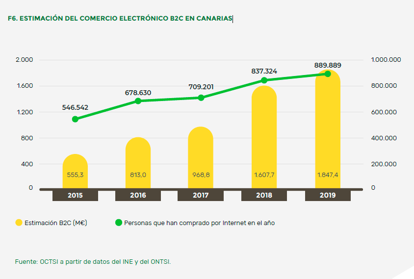 Aplicando el gasto medio anual calculado por el ONTSI a las cifras de compradores en línea del INE se obtiene una estimación de negocio del comercio electrónico para el año 2019 de 45.806 millones de euros en España, y de 1.847 millones de euros en Canarias, un 14,9% más que el año anterior.
