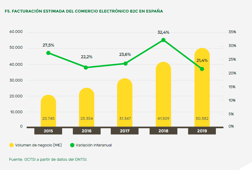 Según la estimación del ONTSI23, la facturación del comercio electrónico B2C en España fue en 2019 de 50.382 millones de euros, con un incremento interanual del 21,4%. Las variables empleadas en su estimación han experimentado el siguiente comportamiento:
