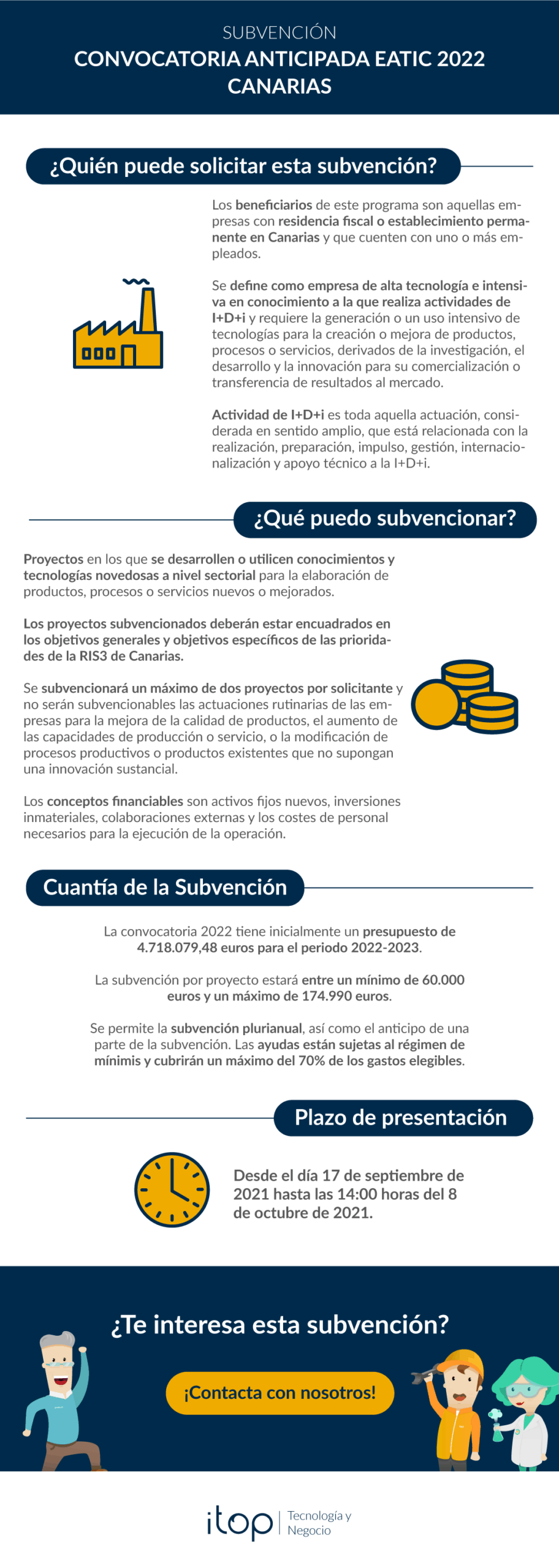 Itop como proveedor te acompañará durante todo el proceso de implantación y te facilitará en tiempo y forma toda la documentación que necesitas presentar para la justificación del proyecto tecnológico que hemos acometido para la mejora de los procesos en tu empresa.