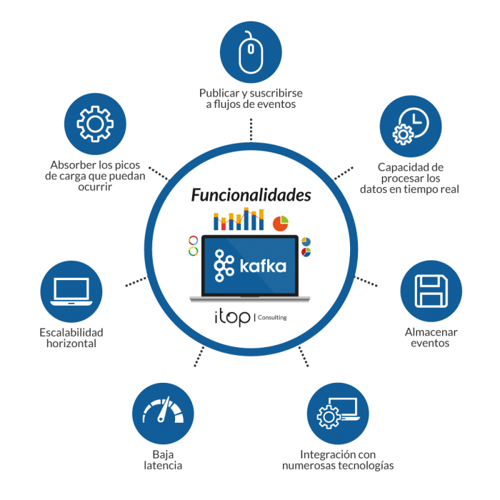 Además de almacenar estos eventos, la funcionalidad se extiende con la capacidad de procesarlos en tiempo real, a medida que se reciben de múltiples fuentes de datos. Kafka se integra con numerosas tecnologías, de esta forma, permite construir flujos de datos en tiempo real entre distintos sistemas y aplicaciones de manera desacoplada.