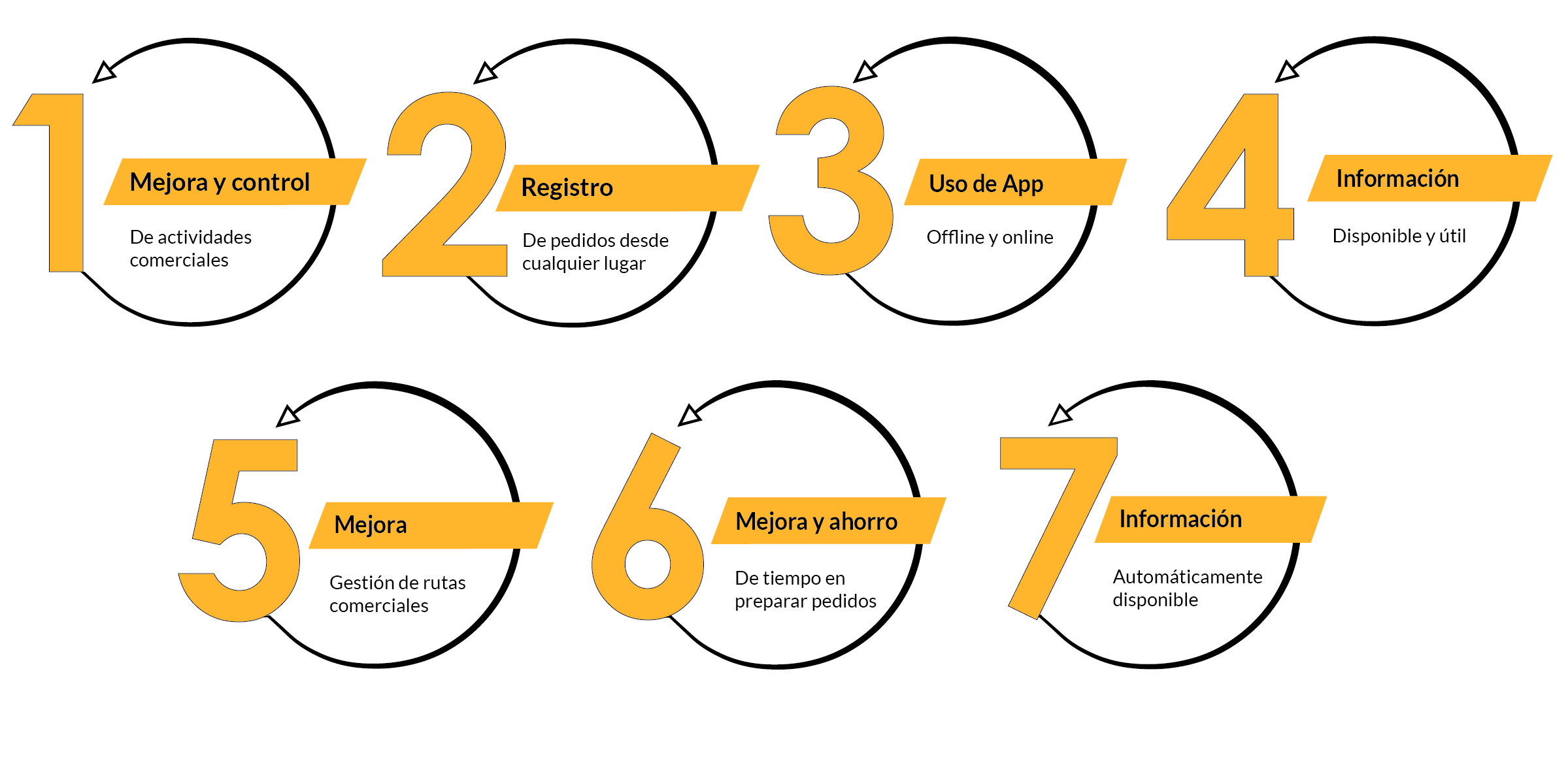 Pedidos: realizar un pedido, ver o importar últimas compras, inserción de artículos por código de barras, foto asociada a cada uno de los artículos, firma de cliente, envío de pedidos pendientes.