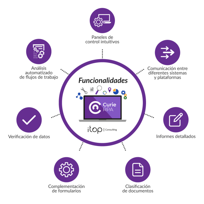 Curie-RPA ofrece un conjunto de funcionalidades que te servirán para para mejorar la eficiencia operativa de tu negocio: